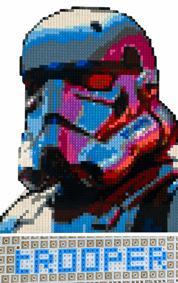 En utilisant les LEGO comme médium, qargo transforme cette icône de la science-fiction en une pièce d’art contemporain, où chaque brique devient un fragment de l’histoire de l’Empire et de son omniprésence dans la galaxie. La dominance du blanc incarne la discipline rigide et l’uniformité imposée aux Stormtroopers, tandis que les nuances de bleu et de rose apportent une relecture presque humanisante, suggérant une dualité entre leur obéissance aveugle et l’individualité qu’ils pourraient cacher sous leur armure.